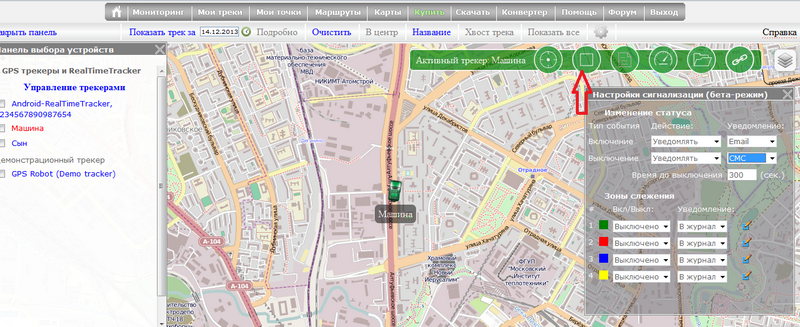<< Перейти к оглавлению раздела << Перейти к общему оглавлению Уведомления о событиях включения/выключения трекера Для каждого трекера, подключенного к аккаунту, можно активировать уведомления о событиях включения/выключения, а так же входа и выхода из определенной области (геозона) В качестве уведомлений могут приходить: 1. Email (уведомление приходит на указанный при регистрации адрес) 2. СМС (уведомление приходит на номер, заданный в настройках личного кабинета) 3. Запись в журнал событий и тревог 4. Сообщение в Telegram Обращаем внимание, что все события включаются только в ручном режиме. Автоматически при добавлении новых устройств все уведомления на новые устройства выключены. Зачем нужны уведомления о включении/выключении трекера? В первую очередь для определения попыток глушения сигналов GPS и GSM. В обычном случае трекер в автомобиле работает 24 часа в сутки и постоянно отправляет данные на сервер мониторинга. Когда злоумышленники используют различные средства глушения сигналов, это однозначно означает, что трекер перестает на сервер мониторинга регулярно присылать данные. Если трекер несколько минут не присылает на сервер мониторинга данные, он считается выключенным и вы получите уведомление об этом. Уведомление о включении трекера может быть полезно в случаях, когда трекер находится постоянно выключенным и используется по случаю. Вы получите уведомление, что трекер начал передачу данных и за ним можно следить в режиме онлайн. Обращаем внимание, что понятия "выключен" и "включен" основаны только на факте есть или нет от трекера постоянный непрекращающийся поток данных. Если трекер не присылает данные и помечается на сайте как "выключен", то причин может быть очень много. Советуем прочитать эту статью нашей документации для выявления причин почему трекер не присылает данные на сервер мониторинга. Расшифровка понятий "трекер включен" и "трекер выключен" подробно описана в этой статье документации. Как управлять уведомлениями? На карте расположена зеленая панель с кнопками. Вторая слева кнопка открывает панель установки геозон. Изменение статуса. Событие "Включение" - выберите "уведомлять" в выпадающем списке и каждый раз, когда трекер будет включен вам придет уведомление. Событие "Выключение" - выберите "уведомлять" и каждый раз, когда от трекера перестанут поступать координаты, вам придет уведомление. Настройка "Время до выключения" - если в течение установленного времени от трекера не поступит ни одной координаты, трекер будет считаться выключенным. На сайте значок трекера изменит цвет на красный. Если событие "Выключения" активировано, вам придет уведомление. << Перейти к оглавлению раздела << Перейти к общему оглавлению |
