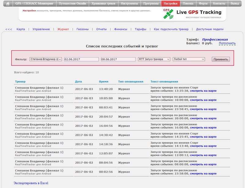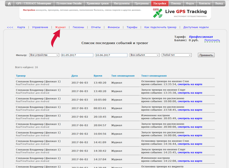 << Перейти к оглавлению раздела << Перейти к общему оглавлению Журнал Где найти журнал? Зайдите в меню "GPS/ГЛОНАСС Мониторинг" Горизонтальное меню раздела -> пункт "Управление трекерами" Пункт верхнего меню "Журнал" Что записывается в журнал? В журнал записываются: